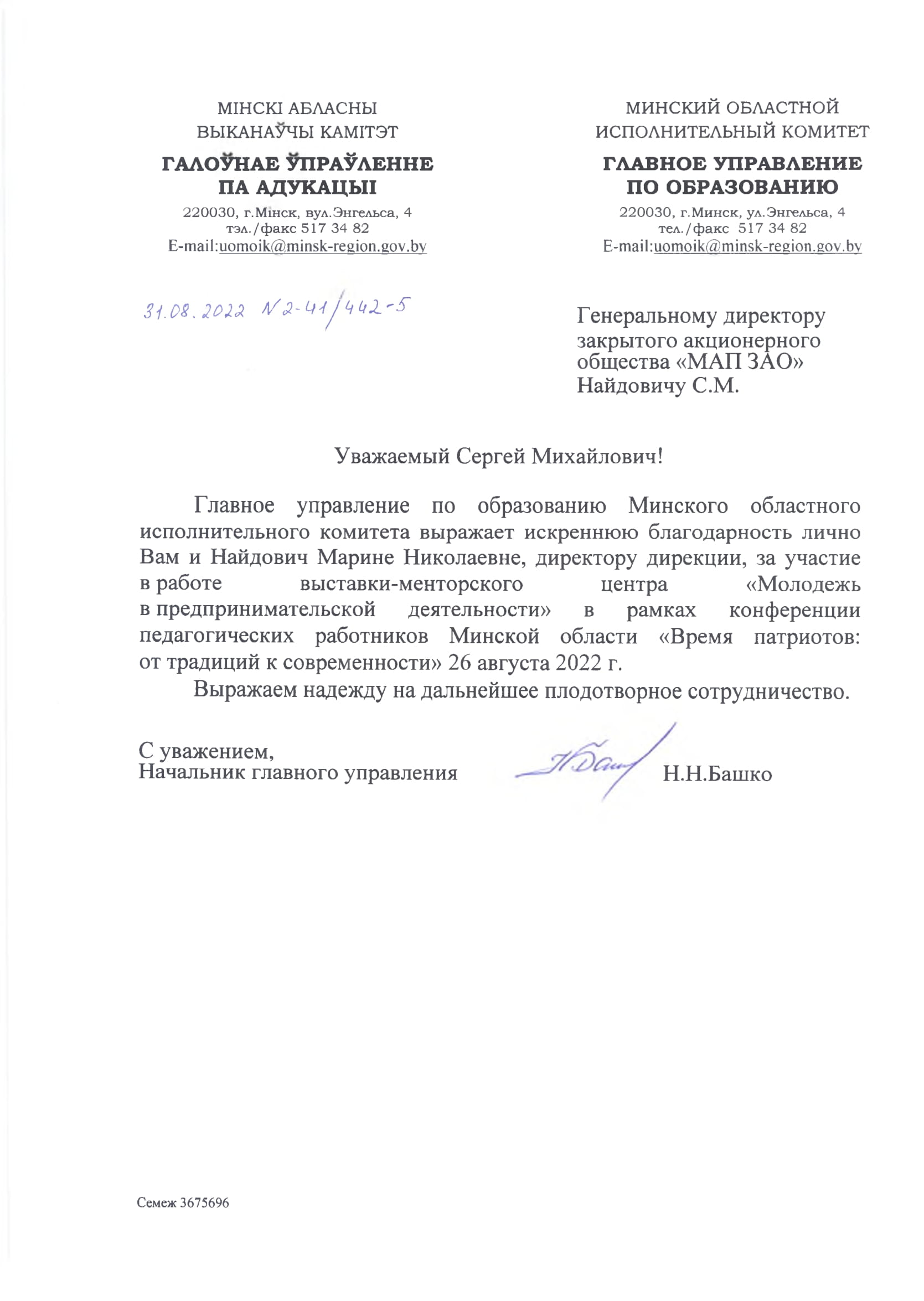 Главное управление по образованию Минского областного исполнительного комитета выражает искреннюю благодарность Найдовичу Сергею Михайловичу, и Найдович Марине Николаевне, директору дирекции, за участие в работе выставки-менторского центра «Молодежь предпринимательской деятельности» в рамках конференции педагогических работников Минской области «Время патриотов: от традиций к современности» 26 августа 2022 г.