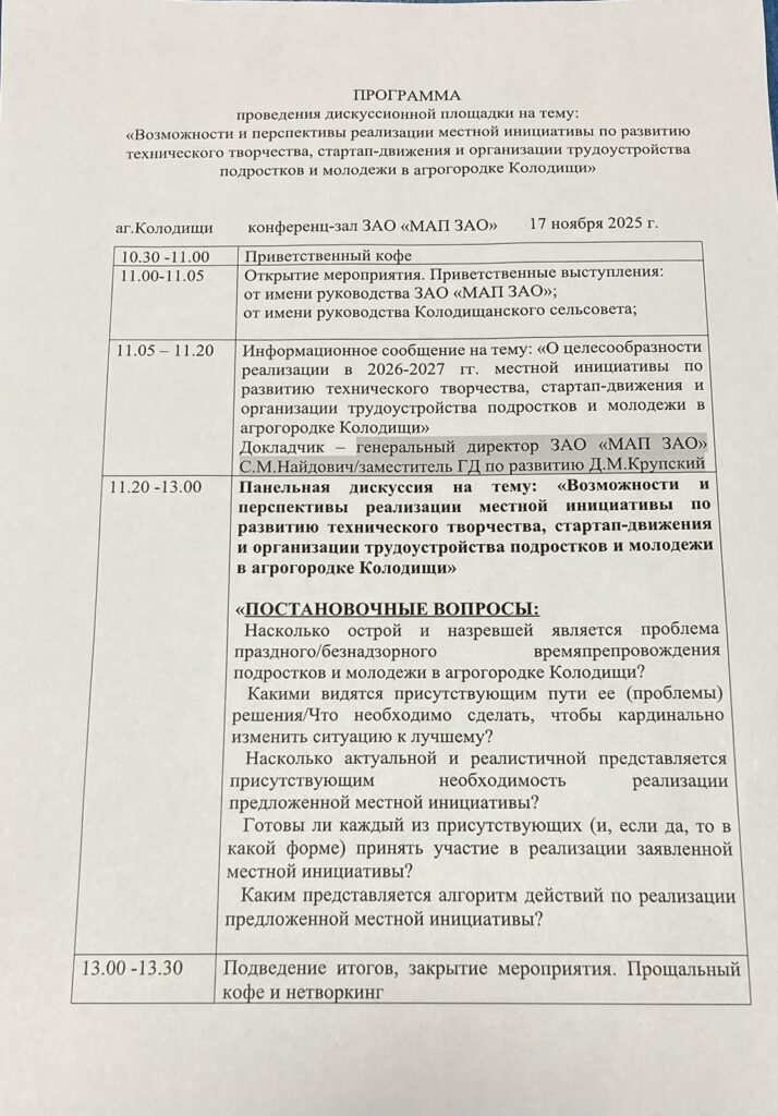 Дискуссионная площадка по вопросам развития технического творчества, стартапов и организации занятости молодежи пройдет 17 ноября 2025 года в конференц-зале бизнес-инкуботора ЗАО «МАП ЗАО»