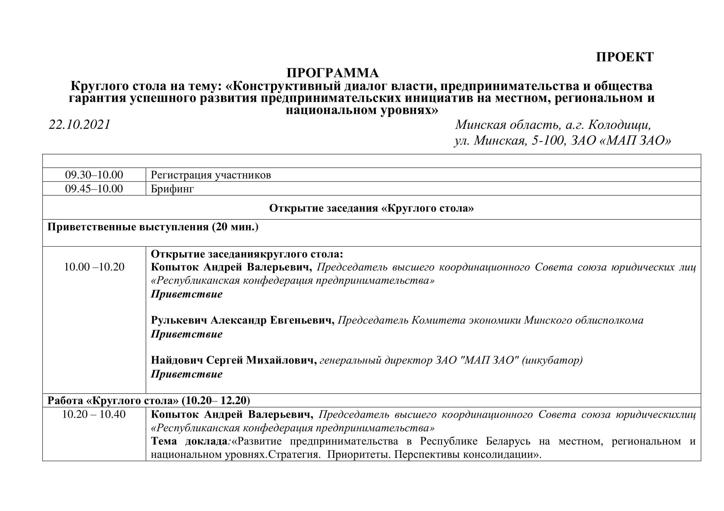 Круглый стол на тему: «Конструктивный диалог власти, предпринимательства и общества — гарантия успешного развития предпринимательских инициатив на местном, региональном и национальном уровнях» состоится 22 октября 2021 года в конференц-зале бизнес-инкубатора ЗАО «МАП ЗАО» Минский район, аг.Колодищи, ул.Минская, д.5.