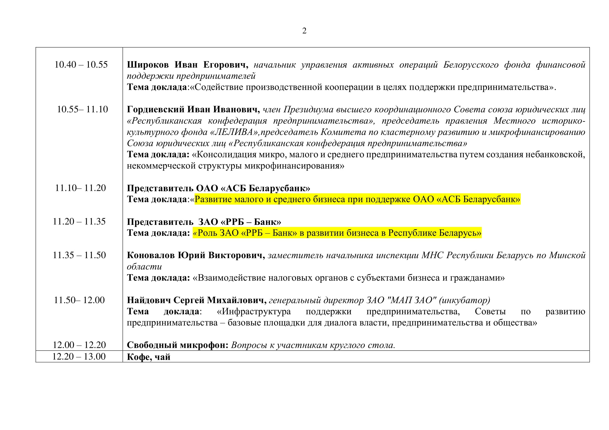 В работе «круглого стола» по Минской области примут участие представители профильных Министерств (ведомств): Министерство экономики – Белорусский фонд финансовой поддержки предпринимательства, Инспекция Министерства по налогам и сборам по Минской области, ГУ «Администрация свободной экономической зоны «Минск»», УП «Минское отделение БелТПП», ОАО «АСБ Беларусбанк», ЗАО «РРБ-Банк», представители делового сообщества, бизнеса, региональных и отраслевых бизнес-ассоциаций.